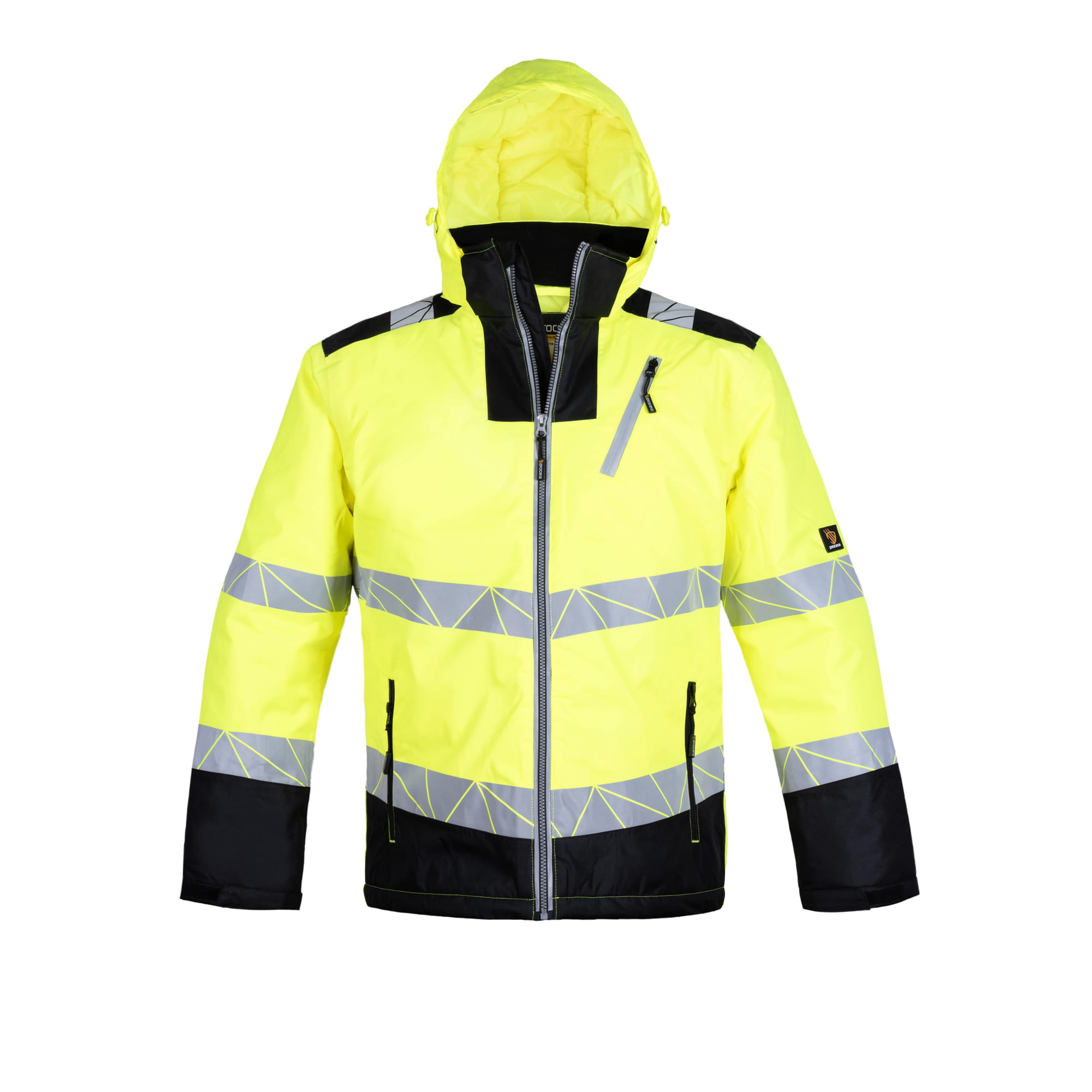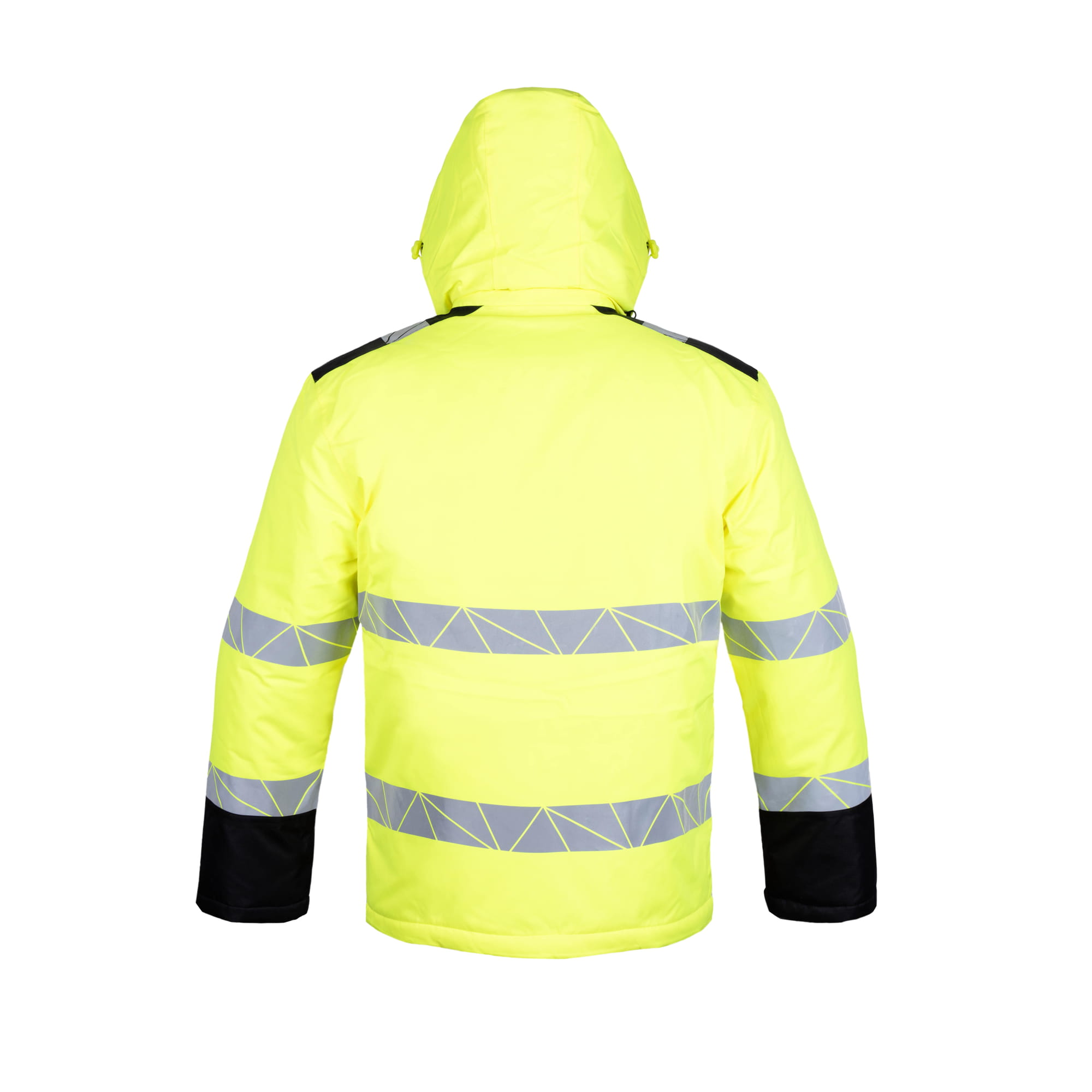 Kurtka softshell hi-vis klasy II, 100% poliester, neonowy żółty z czarnymi wstawkami. Odpinany kaptur, kieszenie na zamek, regulowane mankiety. Pasy odblaskowe 360°. Zgodna z PN-EN ISO 13688:2013 i EN ISO 20471:2013 A1:2016.