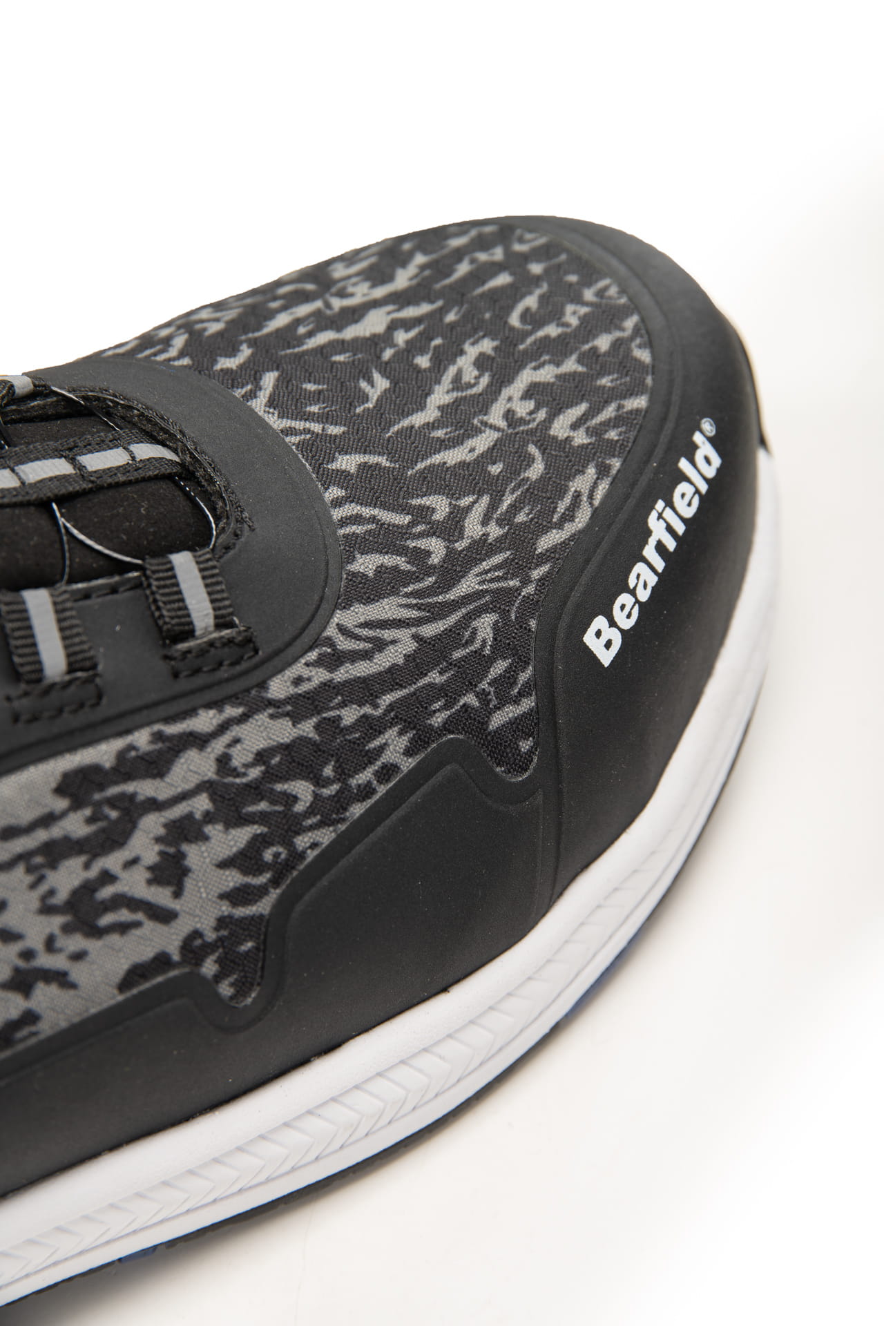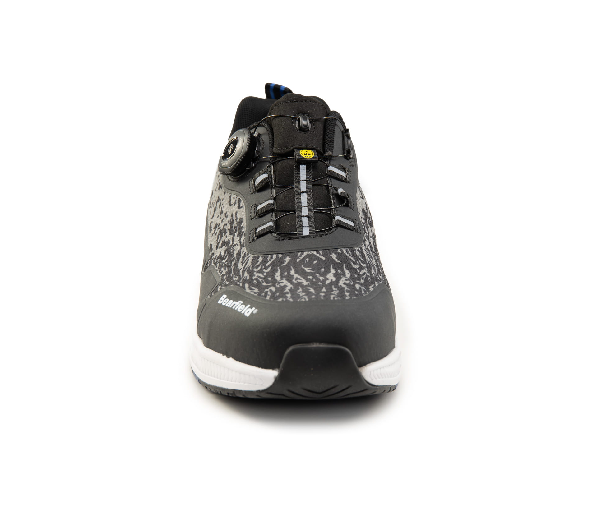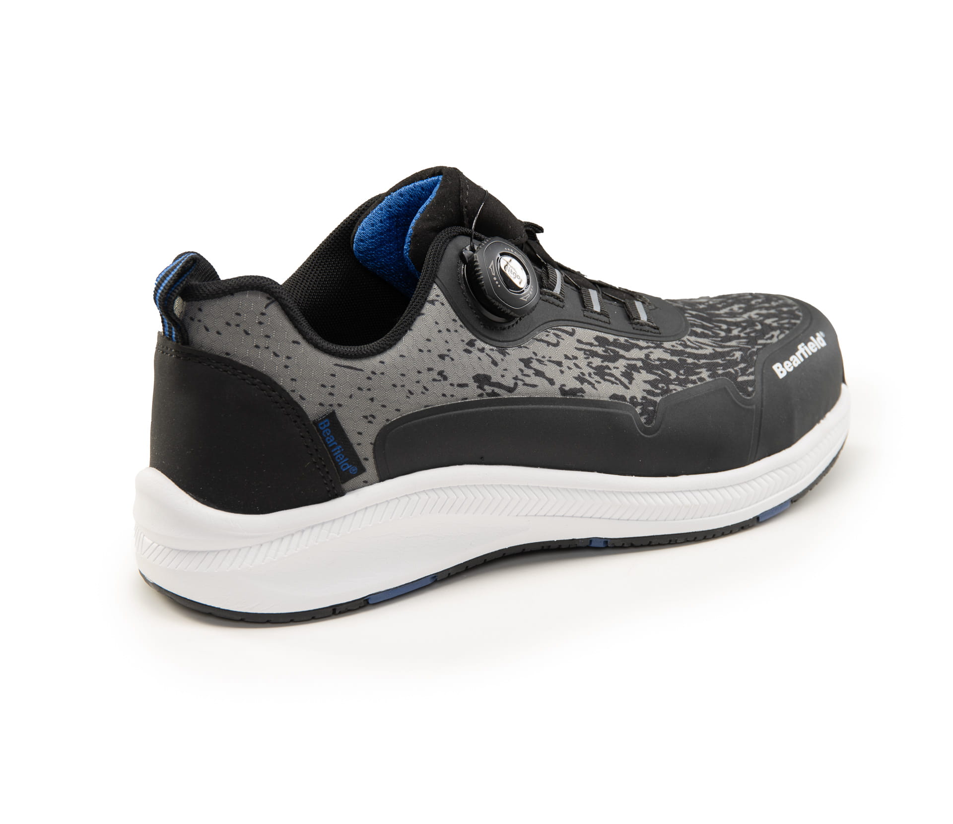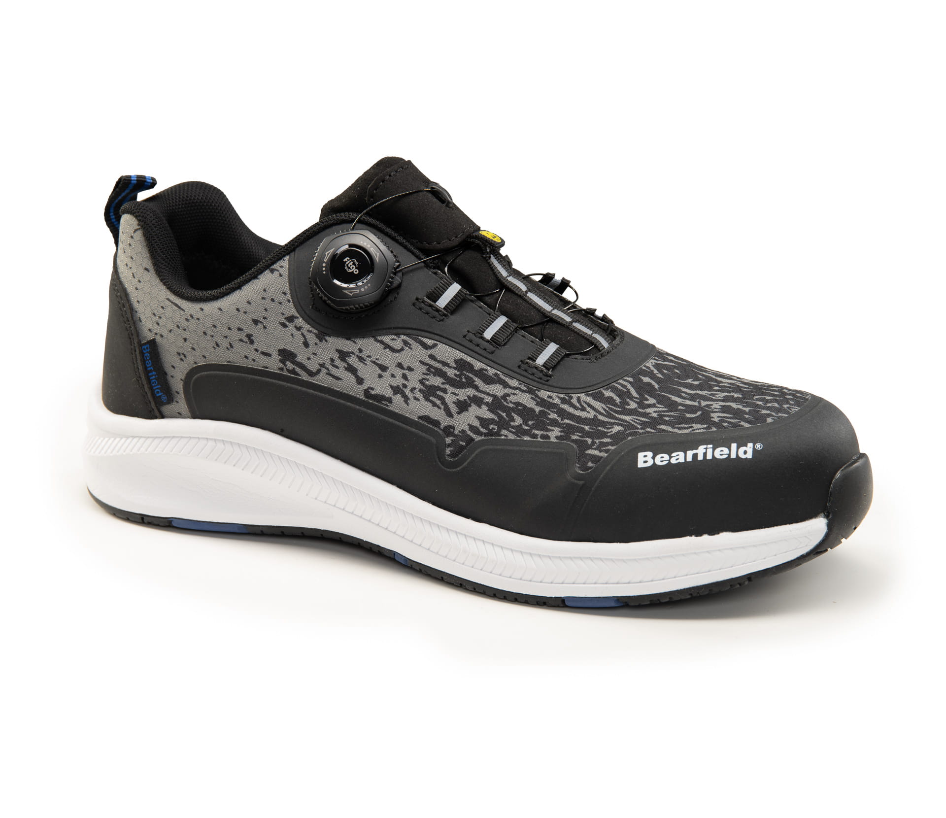 Półbuty ochronne BEARFIELD MILTON S1PS ESD z systemem zapięcia BOA (FITGO). Kompozytowy podnosek (200 J / 15 kN), kevlarowa wkładka antyprzebiciowa (1100 N). Cholewka z tkaniny poliestrowej, stalowy kolor, czarne nici. Wyściółka higroskopijna, wkładka antybakteryjna i wymienna. Podeszwa EVA/GUMA – antypoślizgowa (SR), olejoodporna (FO), ESD, z amortyzacją pięty. METAL FREE, z elementami odblaskowymi. Norma EN ISO 20345, kategoria S1PS ESD.