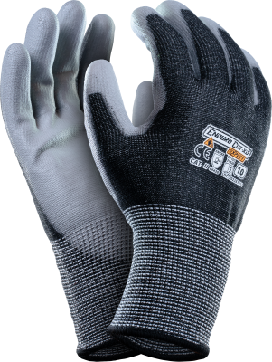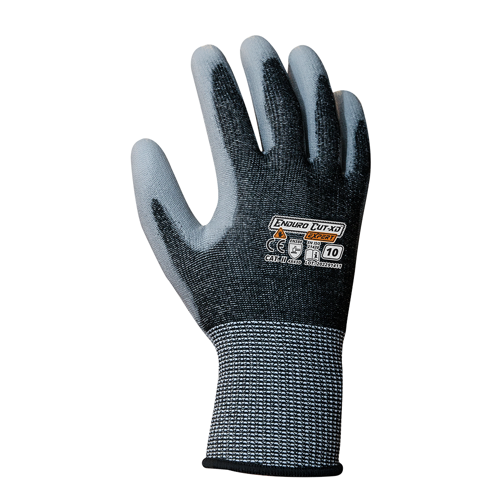 Rękawice antyprzecięciowe Enduro Cut XD Exper z przędzy HPPE, włókna szklanego i spandexu, powlekane poliuretanem. Odporność na przecięcie – poziom D. Elastyczne, miękkie, nie podrażniają skóry. Idealne do pracy z metalem i montażu. EN388: 4X43D.