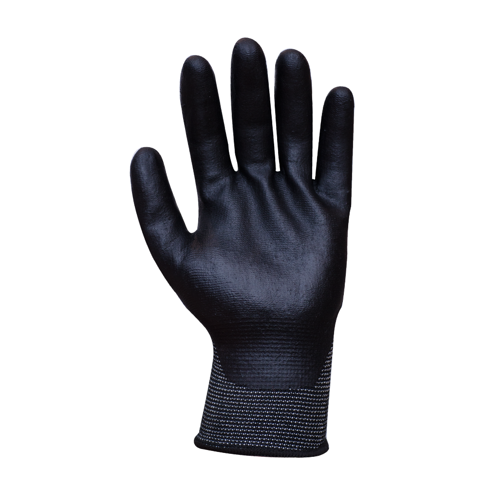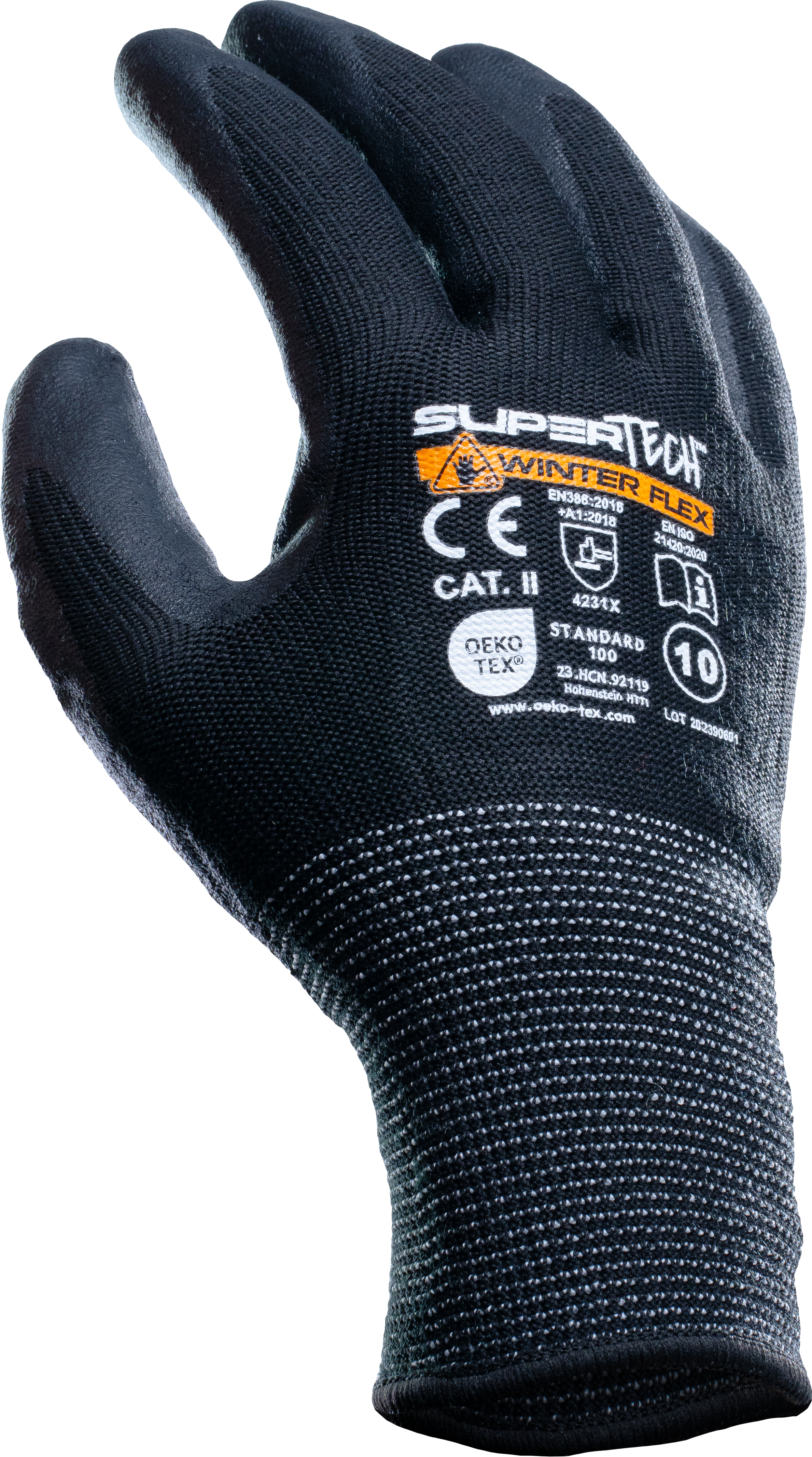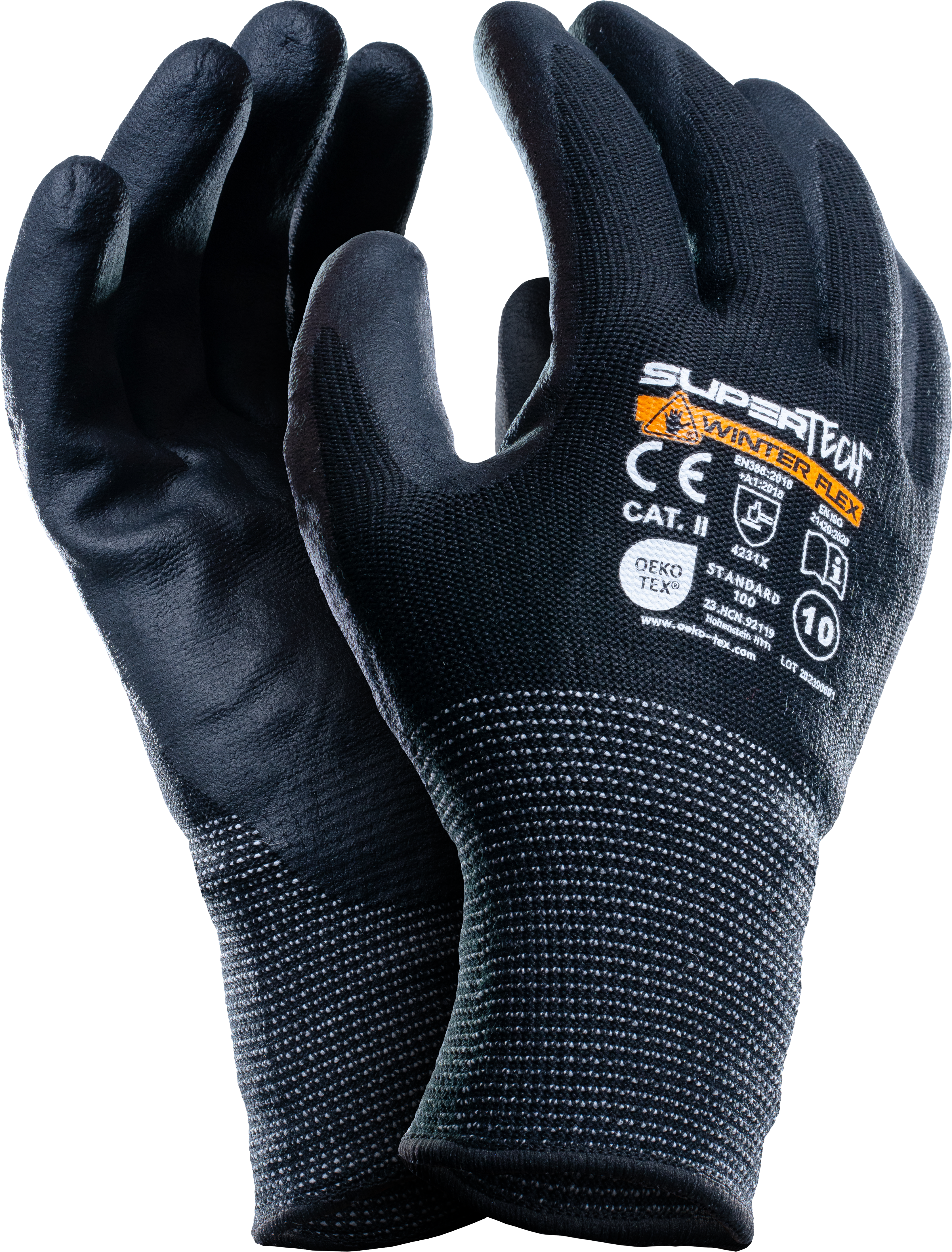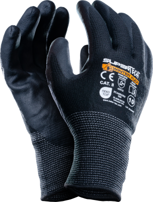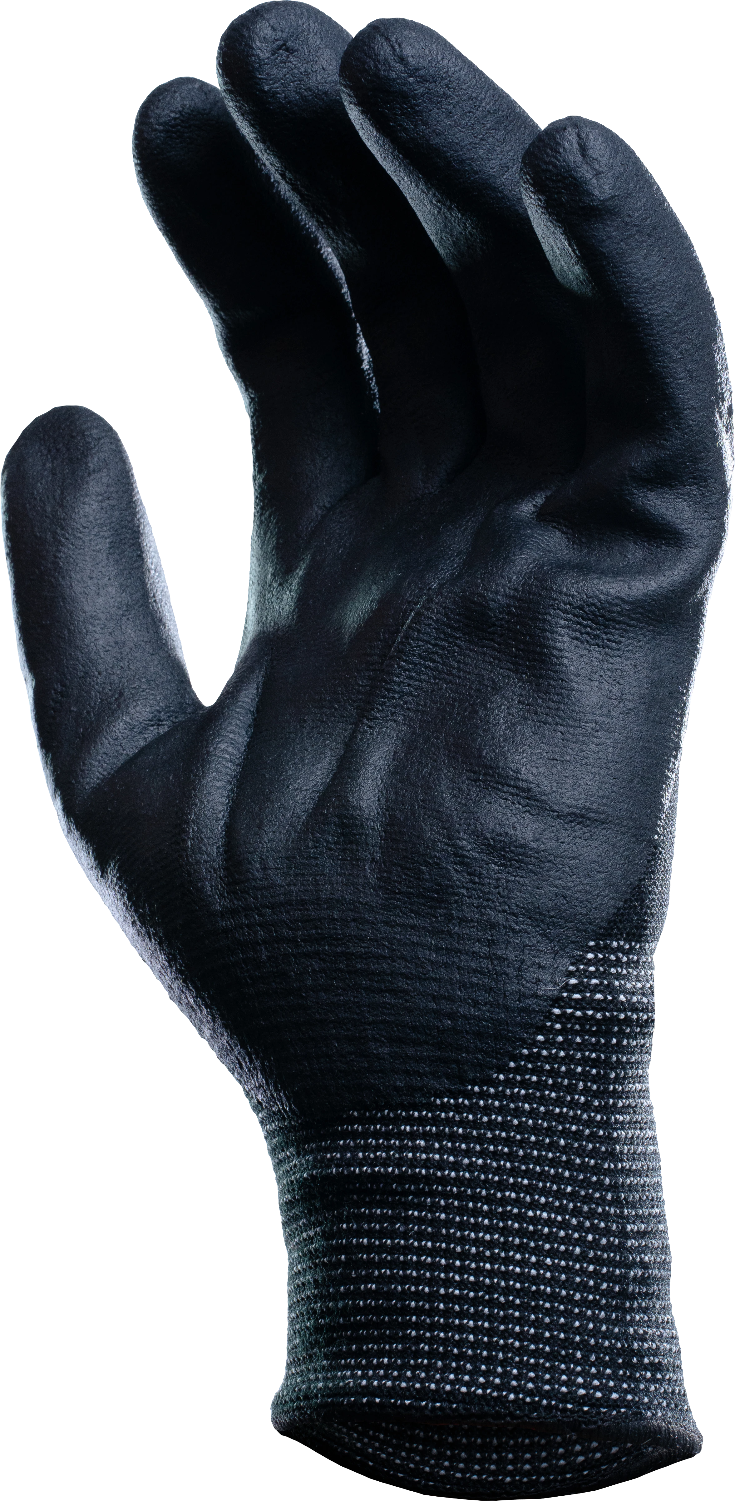 Rękawice ocieplane OEKO-TEX STANDARD 100, z dzianiny nylonowo-akrylowej (15G U2), powlekane mikropianką nitrylową NBR importowaną z Niemiec. Kolor czarny, zakończone ściągaczem.