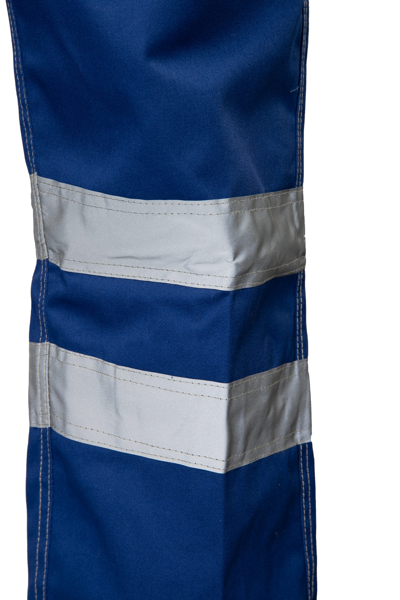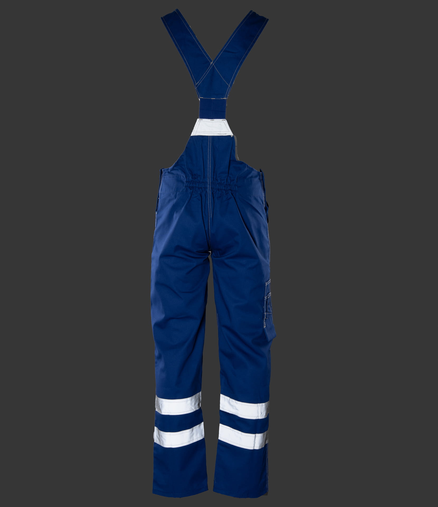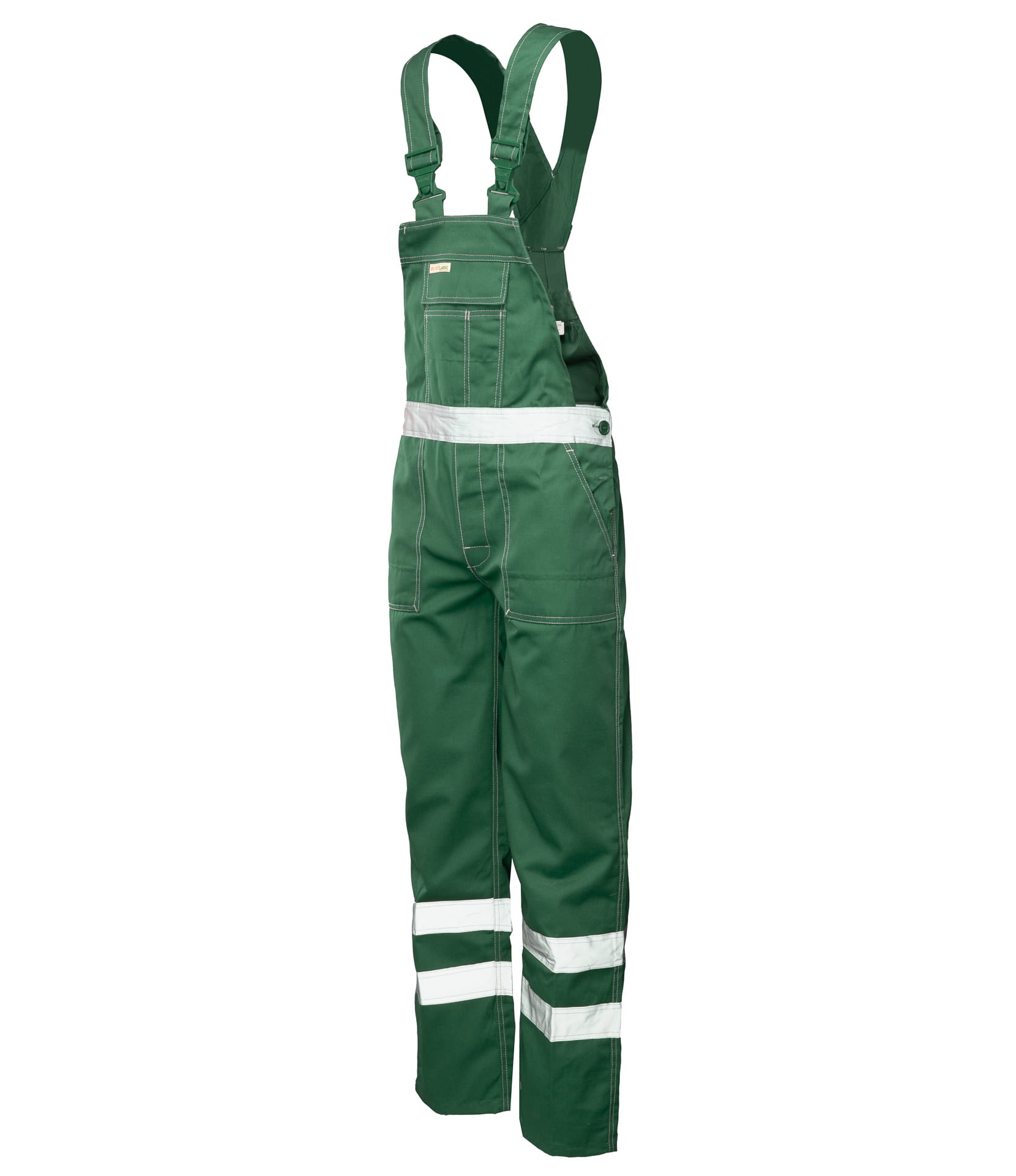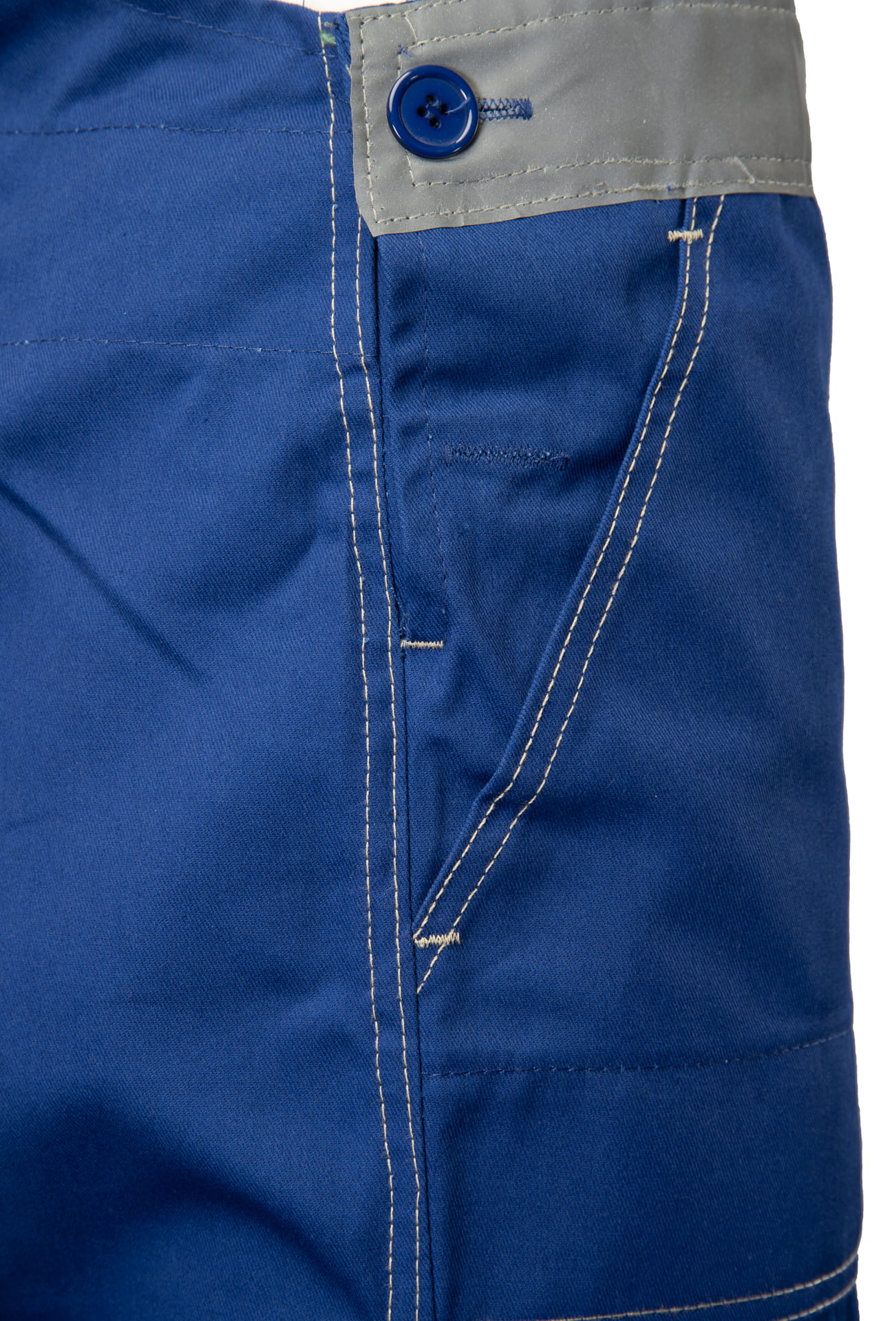 Dzięki regulacji w pasie za pomocą guzików i gumki wszytej w tylnej części, spodnie dopasowują się do sylwetki, zapewniając komfort podczas całego dnia pracy. Podwójne taśmy odblaskowe o właściwościach fluorescencyjnych poprawiają widoczność i bezpieczeństwo w warunkach ograniczonej widoczności.