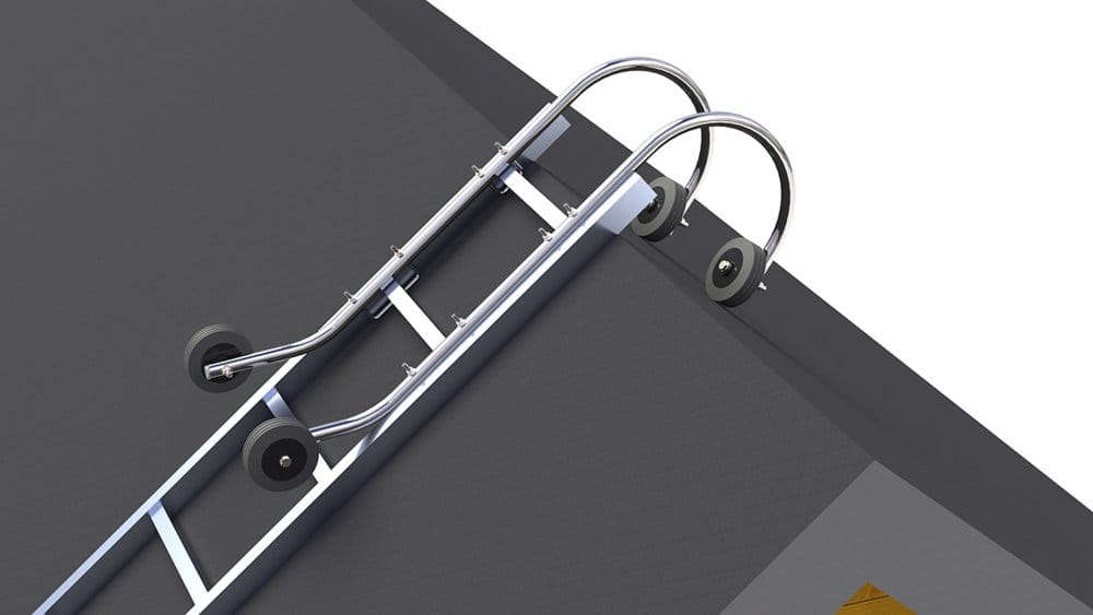 - transport na wózku odbywa się na „lewej” stronie, po dojechaniu końcem drabiny z częścią hakową do kalenicy, obraca się całą drabinę z uchwytem na „prawą” stronę i cześć hakowa z kołami zamocowanymi poprzecznie blokuje się na kalenicy, umożliwiając bezpieczne korzystanie z drabiny